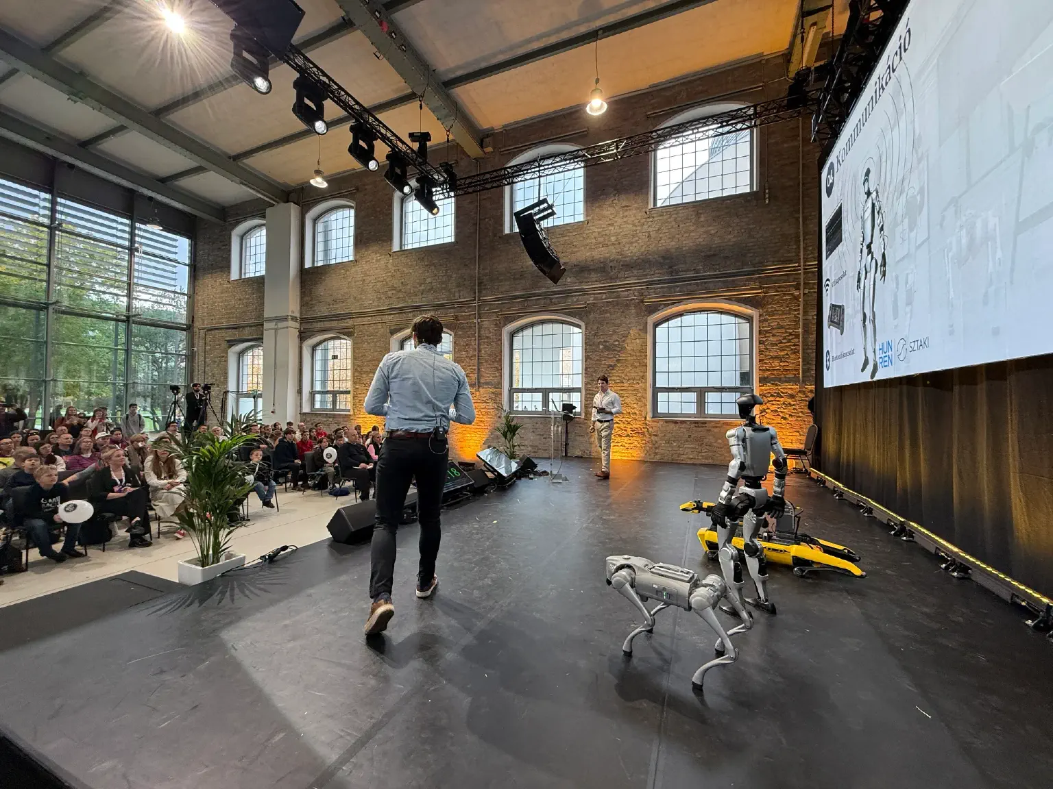 In the foyer, the institute’s drawing robot and a ground research vehicle, Husky, were available for hands-on exploration. Outside the building, an autonomous vehicle parked on site could also be viewed. On the first day of the event, several researchers from HUN-REN SZTAKI gave presentations, and the institute’s robots were also present: two quadruped robots and one humanoid robot were showcased up close. A professional roundtable discussion on the first day was moderated by András Benczúr, Head of the HUN-REN SZTAKI Artificial Intelligence Research Laboratory, while on the second day the discussion was led by Péter Gáspár, Head of the Systems and Control Theory Research Laboratory.